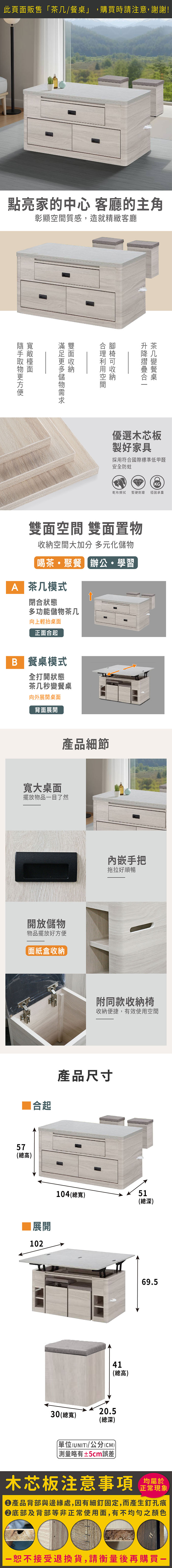 凡達機能升降茶几/餐桌(附椅凳)