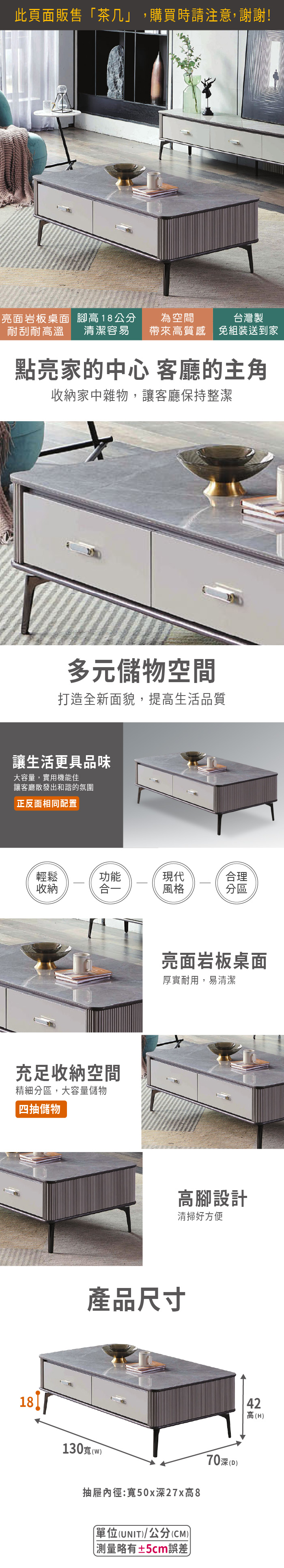 瑞克4.3尺岩板大茶几(寬130x深70x高42cm)