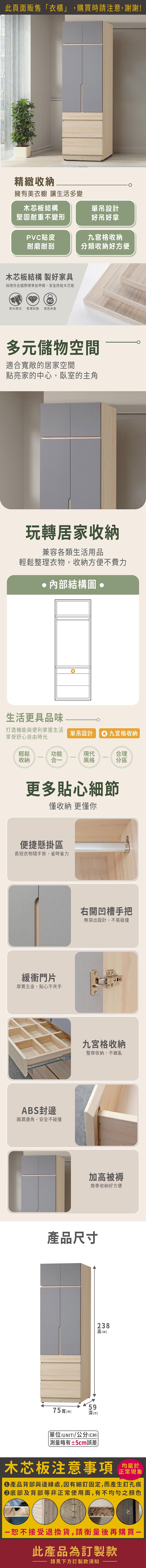 水芳2.5尺三抽加高衣櫃(寬75x深59x高238cm)(訂製款)