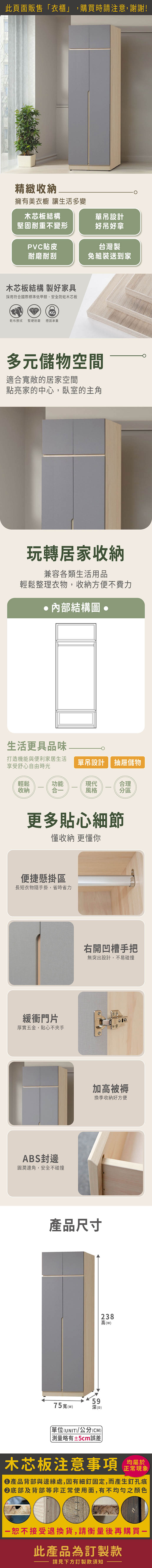 水芳2.5尺內抽加高衣櫃(寬75x深59x高238cm)(訂製款)