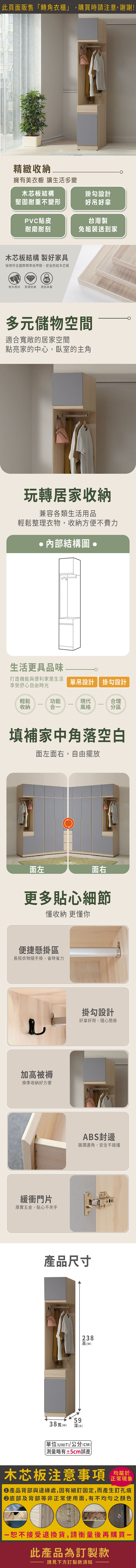 水芳1.3尺加高轉角衣櫃(寬38x深59x高238cm)(訂製款)左型