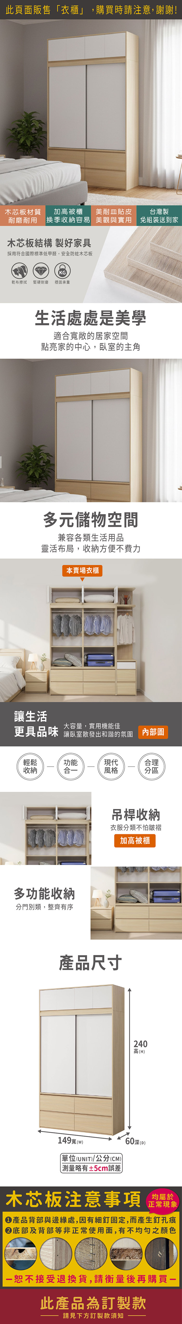 卡蘿經典5尺加高四抽推門衣櫃(寬149x深60x高240cm)(訂製款)