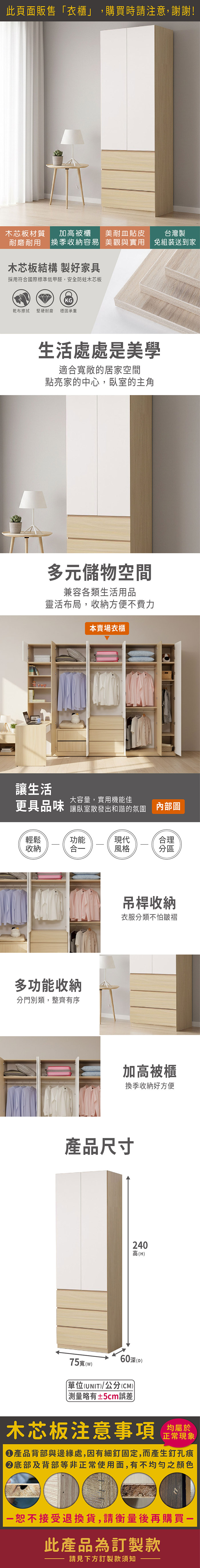 卡蘿經典2.5尺加高三抽衣櫃(寬75x深60x高240cm)(訂製款)