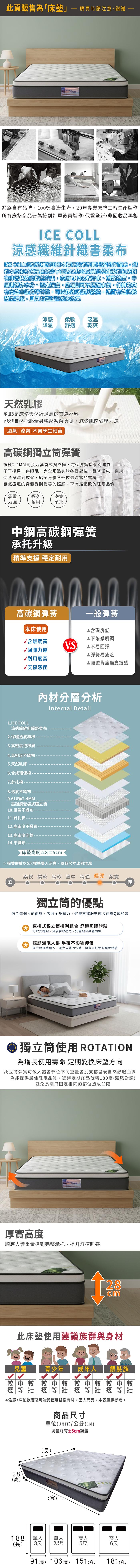 艾瑞乳膠涼感厚針織加高硬式獨立筒床墊-單大3.5尺